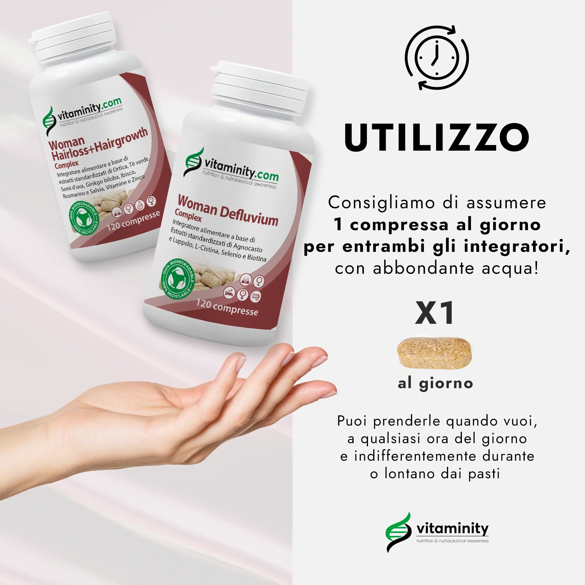 2. Vitaminity Woman Hairloss+Hairgrowth Complex è un integratore alimentare innovativo per capelli, formulato con numerosi estratti vegetali tra cui Ortica, Tè verde, Semi d’uva, Ginkgo biloba, Hibiscus, Rosmarino e Salvia, oltre a numerose vitamine e zinco.